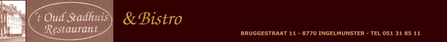 Joseline en Martin heten u van harte werlkom ! Restaurant 't Oud Stadhuis is gelegen in hartje Ingelmunster. Je bent altijd welkom, zowel voor een uitgebreid diner in het Restaurant als voor een snelle hap in de Bistro. U kan steeds reserveren op telefoonnummer 051 31 85 11 | ||||